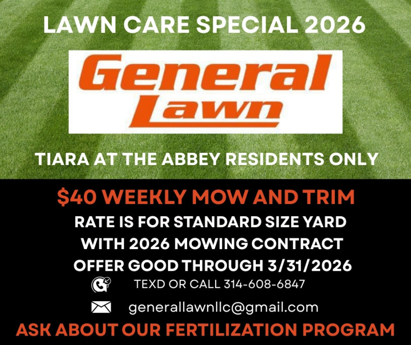 General Lawn, the vendor that services the common grounds, is offering a 2026 lawn care special for Tiara at the Abbey residents only.